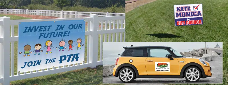 Kustom Imprints is known for its quality custom screen printing, embroidery, and promotional products – but did you know we also offer a wide range of full-color signs & banners? We can put your message, logo, or design on a variety of display advertising media, including banners, corrugated plastic lawn signs, posters, door magnets, window cling decals, and more. Review our options online, then contact one of our sales staff members for questions or to place an order.